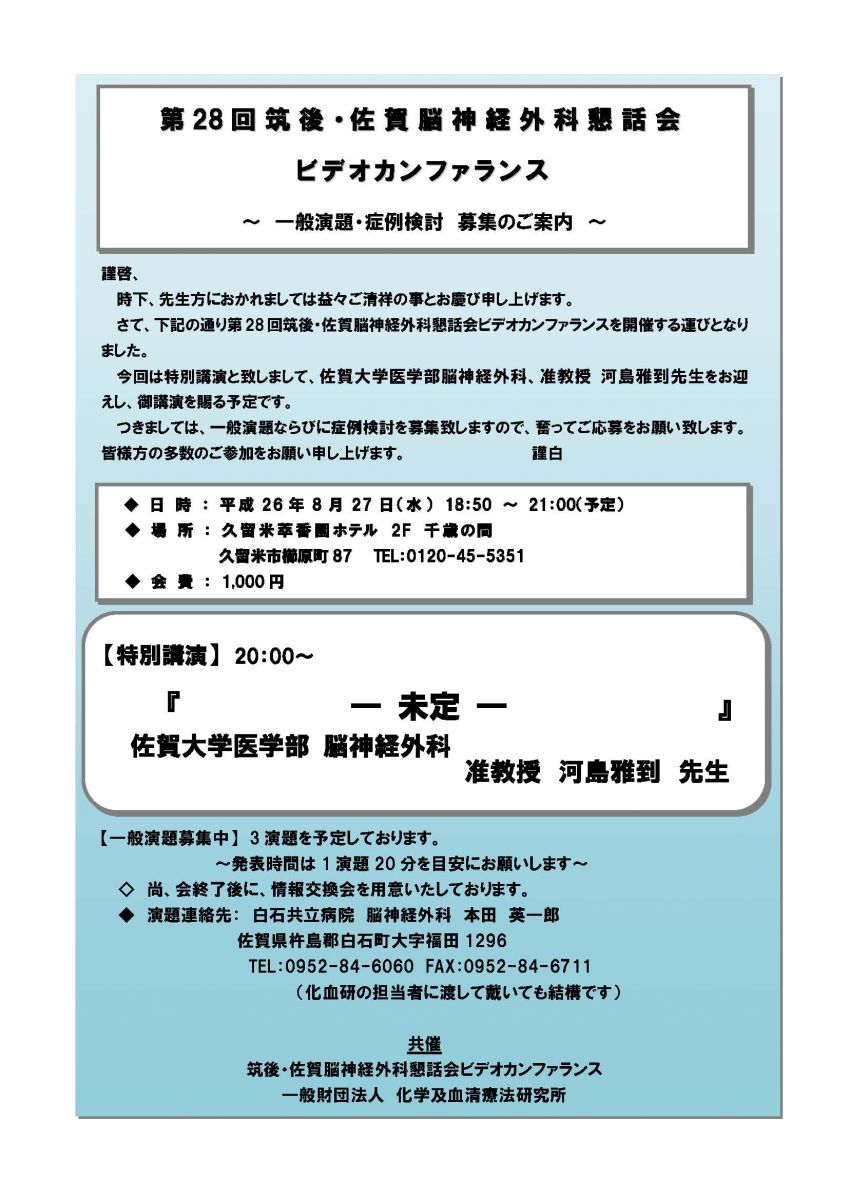 【医療従事者の方へ】8/27(水)「第28回筑後佐賀脳神経外科ビデオカンファランス」のご案内