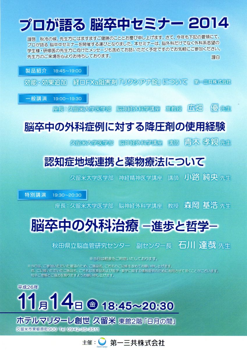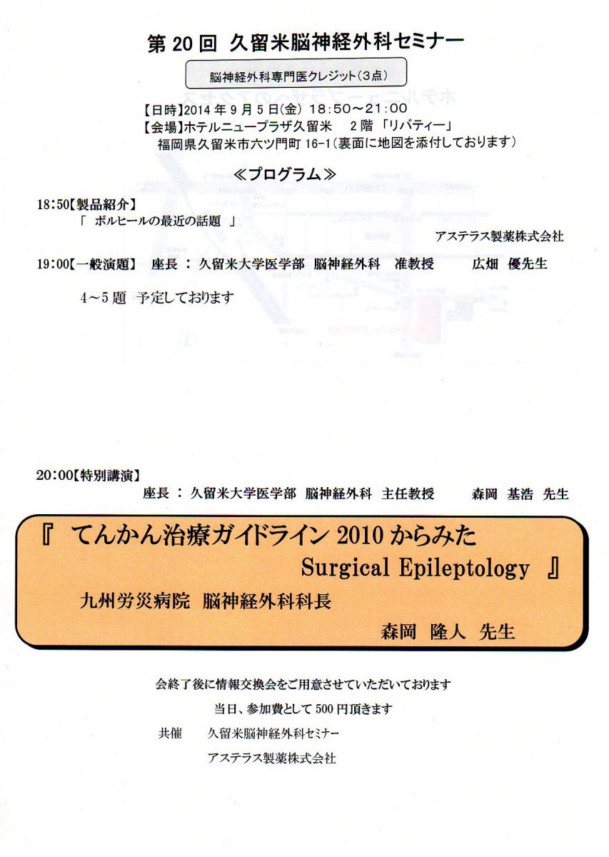 【医療従事者の方へ】9/5(金)「第20回久留米脳神経外科セミナー」のご案内