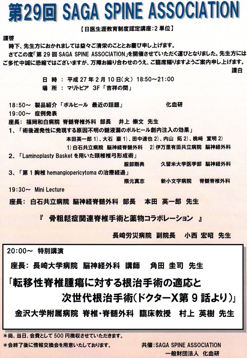 【医療従事者の方へ】2/10(火)「第29回 SAGA Spine Association」のご案内